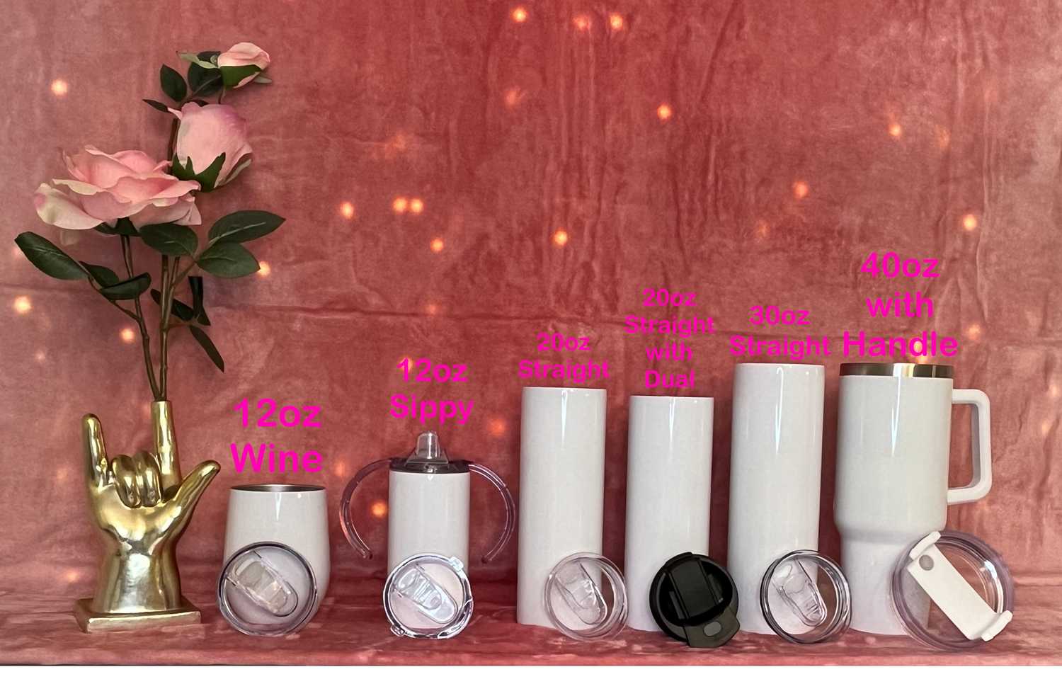 These beautiful vibrant custom-made tumblers can hold up to 12oz, 20oz, 30oz or 40oz of your favorite hot or cold drink.